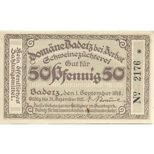 | Obverse lettering | Kein öffentliches Zahlungsmittel. Domäne Badetz bei Zerbst Schweinezüchterei Gut für 50 Pfennig 50 Badetz, den 1. September 1918: Gültig bis 31. Dezember 1921. Dieser Schein hat nur Gültigkeit im Gutsbezirk Badetz für den inneren Konsum-u. Kantinenverkehr. (Translation: Badetz ist ein besonderer Ort, denn hier geschah kein Schweinemord; Wir waren weiblicher Gestalt, da macht der Diplomat selbst halt. Drum fühlen wir uns sehr geehrt und haben kräftig uns vermehrt.) |