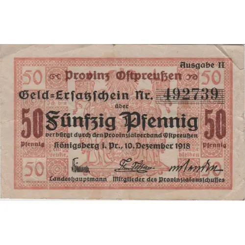 | Obverse lettering | 50 Fünfzig Pfennig 50 Königsberg i.Pr.,10.Dezember 1918 |