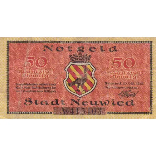 | Obverse lettering | Notgeld 50 (Fünfzig) Pfennig Stadt Neuwied |