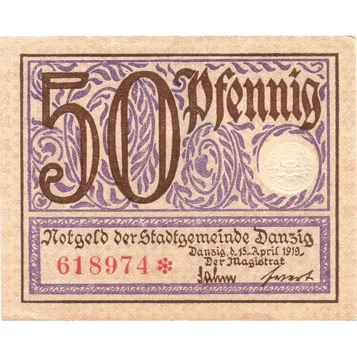 50 Pfennig Notgeld der Stadtgemeinde Danzig Danzig, d. 15. April 1919. Der Magistrat (Translation: 50 Pfennig Notgeld of the municipality Danzig Danzig, April 15th 1919. The magistrate.) |