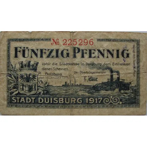 | Vorderseitenlegende | Funfzig pfennig Stadt Duisburg 1917 |