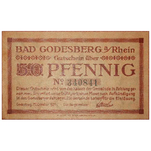 BAD GODESBERG a/ Rhein Gutschein über 50 PFENNIG Dieser Gutschein wird von den Kassen der Gemeinde in Zahlung ge= nommen Er verlfert seine Gültigkeit einen Monat nach Aufkündigung in den GodesbergerZeltungen.Dle Gemelnde haftet für die Einlósung. Godesberg, 25.0ktober 1920. Der Bürgermeister: M.DUMONT SCHAUBERG, KÖLN. (Translation: BAD GODESBERG am Rhein BAD GODESBERG on the Rhine Voucher for 50 PFENNIG This voucher will be accepted in payment by the municipality`s coffers. It will expire one month after cancellation in the GodesbergerZeltungen. Godesberg, October 25, 1920. The Mayor: M.DUMONT SCHAUBERG, COLOGNE.) |