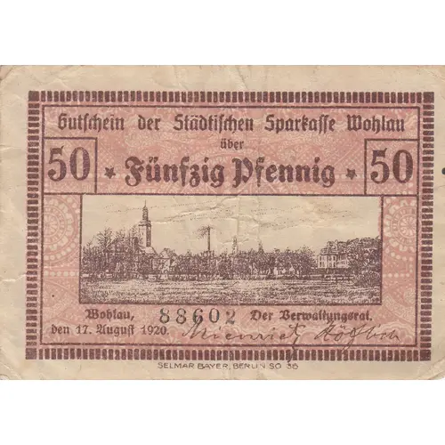 | نوشتههای روی اسکناس | Gutschein der Städtischen Sparkasse Wohlau 50 Fünfzig Pfennig 50 Wohlau den 17. August 1920. Der Verwaltungsrat |