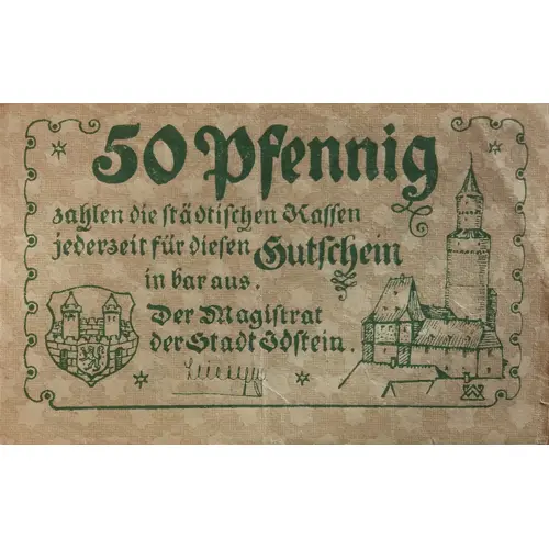 | Signature(s) | Lettering (regular font): 50 Pfennig zahlen die Städtischen Kassen jederzeit für diesen Gutschein in bar aus. Der Magistrat der Stadt Idstein. [Signature] Translation: 50 Pfennig will the town treasury, in exchange for this voucher, pay out in cash at |