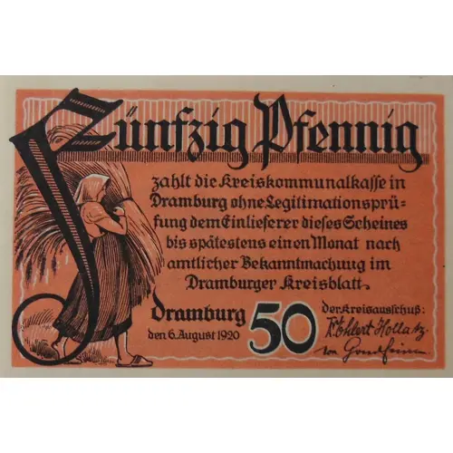 Fünfzig Pfennig zahlt die Kreiskommunalkasse in Dramburg ohne Legitimationsprüfung dem Einlieferer dieses Scheins bis spätestens einen Monat nach amtlicher Bekanntmachung im Dramburger Kreisblatt Dramburg, den 6. August 1920 Der Kreisausschuß: (Translation: The municipal treasury of Dramburg pays fifty pfennigs to the consignor of this ticket no later than one month after official publication in the district newspaper of Dramburg without verification of legitimacy Dramburg, 6 August 1920 The county committee:) |