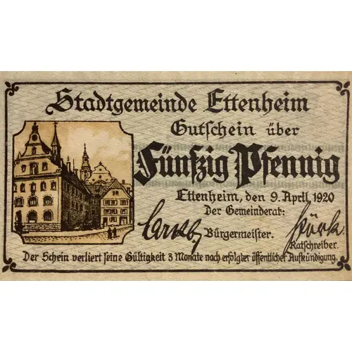 Stadtgemeinde Ettenheim Gutschein über FÜNFZIG PFENNIG Ettenheim,den 9.April 1920 Der Gemeinderat Bürgermeister Ratschreiber Der Schein verliert Seine Gültigkeit 3 Monate nach erfolgter öffentlicher Aufkündigung. |