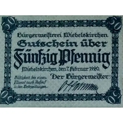 | Obverse lettering | Gutschein uber Funfzig Pfennig Wiebelskirchen, dea 7, februar 1920, |