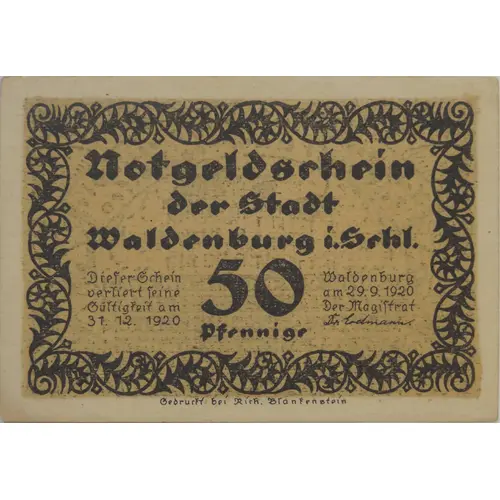 | Obverse lettering | Notgeldschein der Stadt Waldenburg i.Schl. 50 Pfennig |