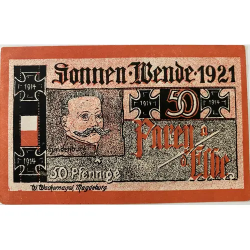 | Obverse lettering | Sonnen . Wende . 1921 Parey Elbe 50Pfennige W. Wackernagel, Magdeburg |