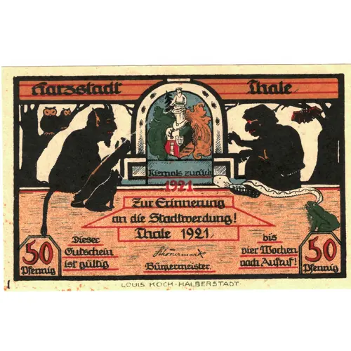 Obverse lettering Harzstadt Thale Niemals zurück 1921 Zur Erinnerung an die Stadtwerdung! Thale 1921 Dieser Gutschein ist gültig bis vier Wochen nach Aufruf! Bürgermeister 50 Pfennig