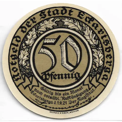 | Legenda do anverso | Notgeld der Stadt Ekartsberga 50 Pfennig Gueltig bis ein Monat nach ortsuebl. Austuendigung Ekartsberga 1.9.21 der Magistrat. Reimeck R Klein, Weimar |