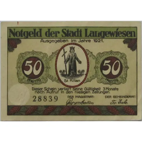 Notgeld der Stadt Langewiesen Ausgegeben im Jahre 1921. 50 Pfennig 50 Pfennig St. Kilian Dieser Schein verliert seine Gültigkelt 3 Monate nach Aufruf in den hiesigen Zeltungen. DER MAGISTRAT: DER GEMEINDERAT: 28838 (Translation: Emergency money of the town of Langewiesen Issued in 1921. 50 Pfennig St. Kilian This bill loses its validity 3 months after being advertised in the local newspapers. The Magistrate: The Municipal Council: 28838) |
