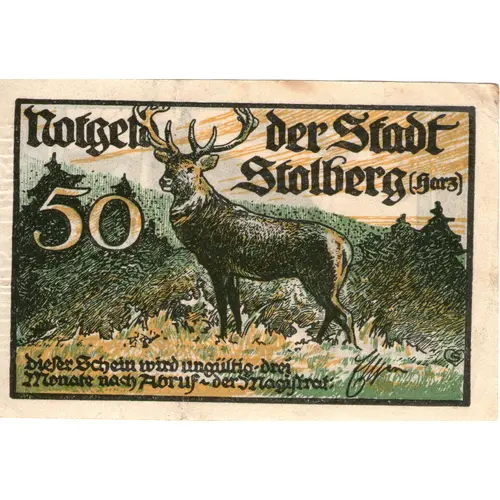 Notgeld Der Stadt Stolberg (Harz) 50 Dieser schein wird ungültig drei monate nach abruf der magistrat (Translation: Emergency money from the city of Stolberg (Harz) 50 This certificate becomes invalid three months after the magistrate`s call) |
