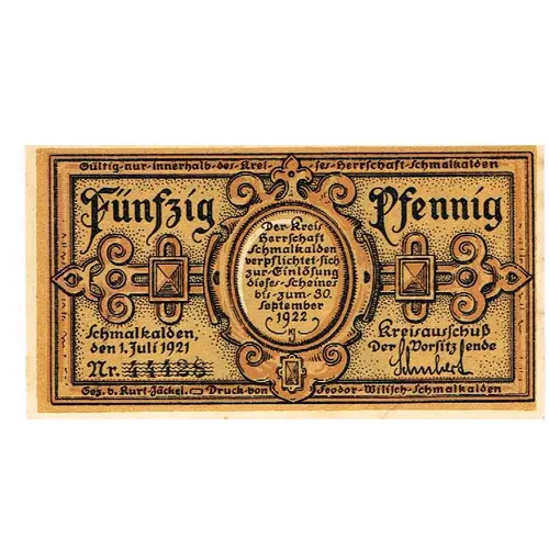 | Opis líce | Gültig nur innerhalb des Kreises Herrschaft Schmalkalden Fünfzig Pfennig Der Kreis Herrschaft Schmalkalden verpflichtet sich zur Einlösung dieses Scheines bis zum 30. September 1922 Schmalkalden, den 1. Juli 1921 |