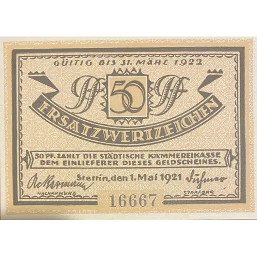 Obverse lettering GÜLTIG BIS 31. MÄRZ 1922 50PF ERSATZWERTZEICHEN 50 PF ZAHLT DIE STÄDTISCHE KÄMMEREIKASSE DEM EINLIEFERER DIESES GELDSCHEINES STETTIN, DEN 1. MAI 1921
