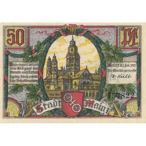 | Vorderseitenlegende | 50 Pf. Mainz, d. 1. Jan. 1921 Der Oberbürgermeister Stadt / Mainz |