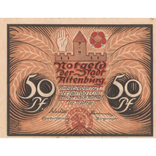 | Legenda do anverso | Notgeld Der Stadt Altenbŭrg 50Pf. 50Pf. Ausgegeben 1921 Derfalltag : Ein Monatnach Aŭfrŭf. Der Stadtrat |