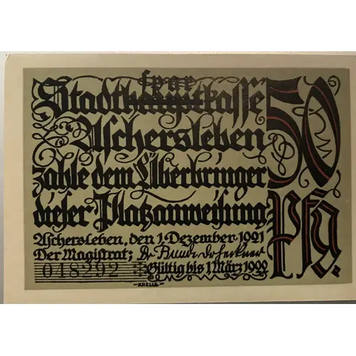 spar Stadthauptkasse Aschersleben zahle dem Überbringer dieser Platzanweisung 50 Pfg. Aschersleben, den 1. Dezember 1921 Der Magistrat; Dr. ??????? 10898 ✻ Gültig bis 1. März 1922 - Krelle - ?? (Translation: The City Savingsbank Aschersleben pays the bearer of this transfer order 50 pfennigs. Aschersleben, December 1, 1921 the magistrate; dr ??????? 10898 ✻ Valid until March 1, 1922) |