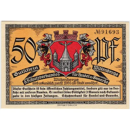 50 Pf Gutschein d. schutzverbandes für Handel u. Gewerbe Wittenberge wird urkundlich zuerst 1265 als stadt eewahnt Dieser gutschein ist öffentliches zahlungsmittel, Sondern gilt nur im derfehr mit unseren kunden. Er verliert seine Gültigfeit 3 monate nach Befanntgabe in den hiesigen zeitungen. Schutzverbandes für Handel u. Gewerbe. Gebr. Parcus München Offsetdruck (Translation: 50 Pfennig Voucher by Association to protect trade and industry Wittenberge first documented as city in 1265 This voucher is public money, But only applies to our customers. It loses its validity after 3 months Notification in the local newspapers. Protection association for trade and Business. Gebr. Parcus Munich Offset printing) |