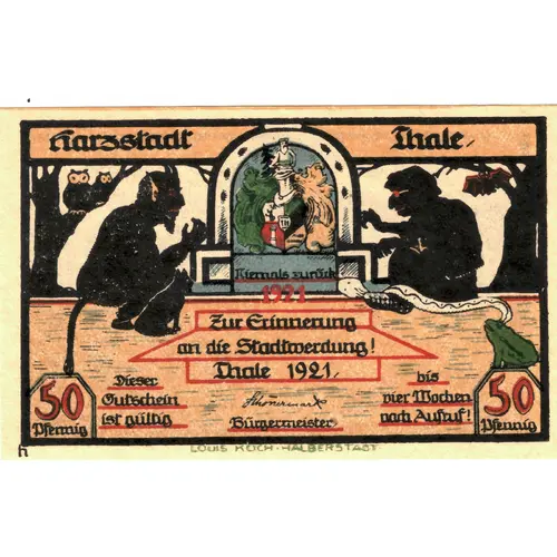 | Obverse lettering | Harzstadt Thale Niemals zurück 1921 Zur Erinnerung an die Stadtwerdung! Thale 1921 Dieser Gutschein ist gültig bis vier Wochen nach Aufruf! Bürgermeister 50 Pfennig |
