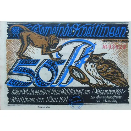 Gemeinde Kneitlingen dieser Schein verliert seine Gültigkeit am 1/November 1921 Kneitlingen den 1. Juli 1921 (Translation: Local community of Kneitlingen this certificate expires on November 1, 1921) |