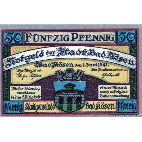 | Obverse lettering | 50 FÜNFZIG PFENNIG 50 Notgeld der Stadt Bad Kösen Bad Kösen, den 1.Juni 1921. Der Magistrat Die Stadtverordneten Dieser Schein verliert seine Gültigkeit einen Monat nach erfolgter Bekanntmachung. Pfennig Stadtgemeinde Bad Kösen Pfennig Otto Henning EG. Greiz |