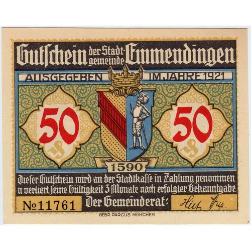 Gutschein der Stadt- gemeinde Emmendingen AUSGEGEBEN IM JAHRE 1921 50 1590 Dieser Gutschein wird an der Stadtkasse in Zahlung genommen u verliert seine Gültigkeit 3 Monate nach erfolgter Bekanntgabe, Der Gemeinderat: (signature) GEBR. PARCUS MÜNCHEN (Translation: Voucher from the municipality of Emmendingen ISSUED IN 1921 50 1590 This voucher will be traded in at the city ticket office and loses its validity 3 months after notification, The council: (signature) GEBR. PARCUS MUNICH) |