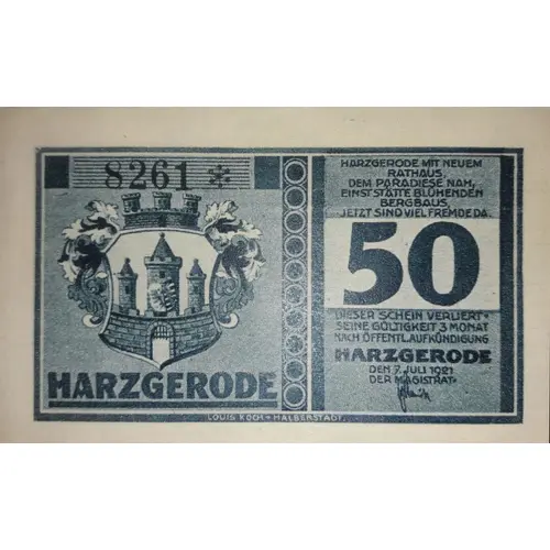 | 表面の銘文 | Harzgerode mit neuem rathaus, dem paradiese nah, einst stätte blûhenden bergbaus, jetzt sindviel fremdeda. Dieser schein verliert seine goltigkeit 3 monat nach öffentlaufkündigung Harzgerode Den 7 juli 1921 |