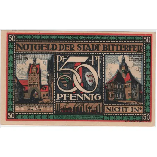 | Obverse lettering | NOTGELD DER STADT BITTERFELD PF50PF 50 PFENNING |