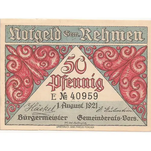 Notgeld Gem. Rehmen 50 Pfennig 1. August 1921 Bürgermeister Gemeinderats-Vors. (Translation: 50 pfennigs August 1st, 1921 Mayor Chairman of the municipal council) |