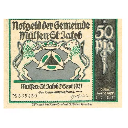 | Obverse lettering | Notgeld der Gemeinde Mülsen-St. Jakob Mülsen-St. Jakob, 2. Sept. 1921 |