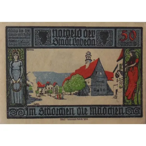 Gültig bis drei Monate nach Aufruf Der Gemeindevorstand Lobeda 1921 Notgeld der Stadt Lobeda 50 Pfennig Im Städtchen die Mädchen (Translation: Valid up to three months after the call The municipal board of Lobeda 1921 Notgeld from the city of Lobeda 50 pfennigs In the little town the girls) |