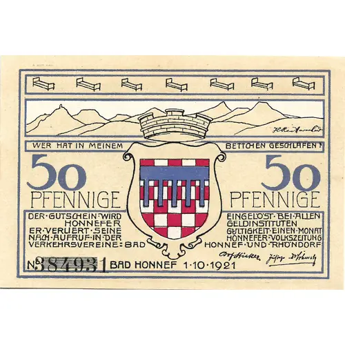 WER HAT AUF MEINEM BETTCHEN GESCHLAFEN? 50 PFENNIGE 50 PFENNIGE DER GUTSCHEIN WIRD EINGELÖST BEI ALLEN HONNEFER GELDINSTITUTEN ER VERLIERT SEINE GÜLTIGKEIT EINEN MONAT NACH AUFRUF IN DER HONNEFER VOLKSZEITUNG VERKEHRSVEREINE: BAD HONNEF UND RHÖNDORF No. 384931 BAD HONNEF 1.10.1921 |