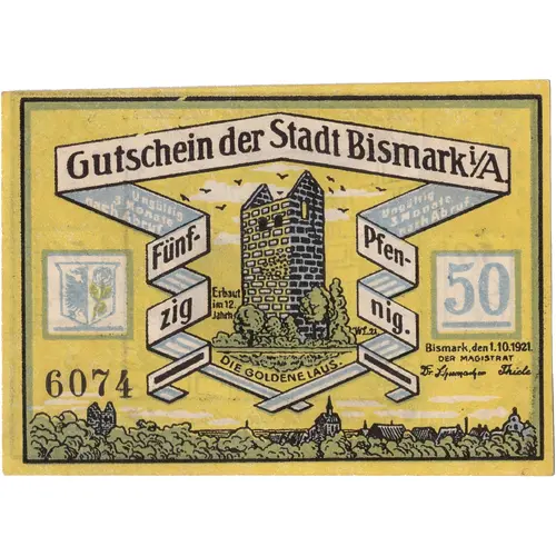 Gutschein der Stadt Bismark i/A. Ungültig 3 Monate nach Abruf Fünfzig Pfennig Erbaut im 12 Jahrh Die Goldene Laus. 50 Bismark, den 1.10.1921 DER MAGISTRAT |