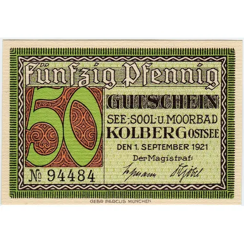 Fünfzig pfennig Gutschein See-, Sool- u Moorbad KOLBERG OSTEE DEN 1, SEPTEMBER 1921 Der Magistrat (signature) GEBR PARCUS MÜNCHEN (Translation: Fifty pfennigs Voucher Lake, Brine and Mud baths KOLBERG BERING SEA The 1, SEPTEMBER 1921 The magistrate (signature) GEBR PARCUS MUNICH) |