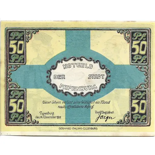 Pf. 50 Pf. NOTGELD DER STADT PAPENBURG Dieser Schein verliert seine Gültigkeit en Monat nach öffentlichem Aufruf. Papenburg den 14. November 1921 Der Magistrat: (Translation: Pf. 50 Pf. EMERGENCY MONEY OF THE CITY OF PAPENBURG This note loses its validity one month after the public announcement. Papenburg November 14, 1921 The magistrate:) |