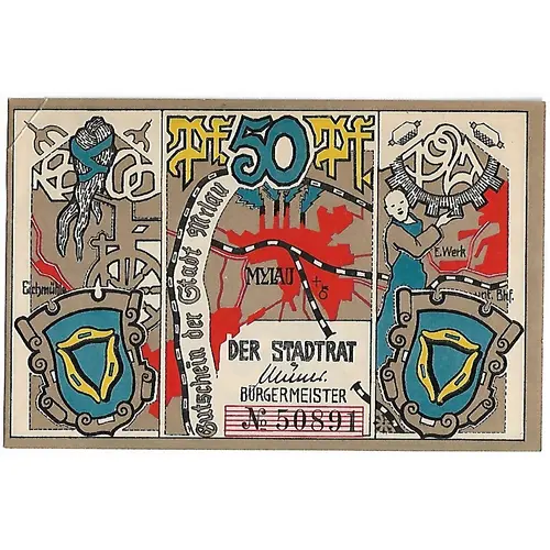 | Obverse lettering | 50 pf. MYLAU DER STADTRAT |