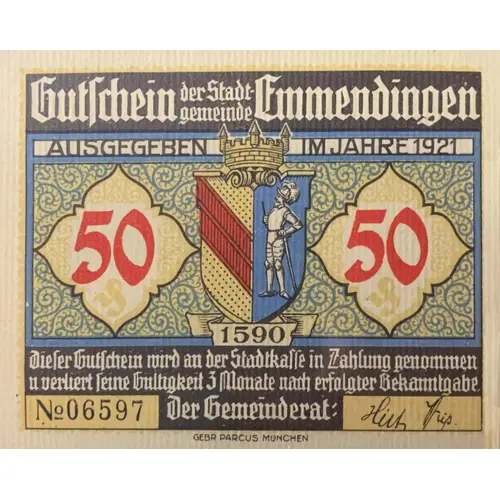 Gutschein der Stadt- gemeinde Emmendingen AUSGEGEBEN IM JAHRE 1921 50 1590 Dieser Gutschein wird an der Stadtkasse in Zahlung genommen u verliert seine Gültigkeit 3 Monate nach erfolgter Bekanntgabe, Der Gemeinderat: (signature) GEBR. PARCUS MÜNCHEN (Translation: Voucher from the municipality of Emmendingen ISSUED IN 1921 50 1590 This voucher will be traded in at the city ticket office and loses its validity 3 months after notification, The council: (signature) GEBR. PARCUS MUNICH) |
