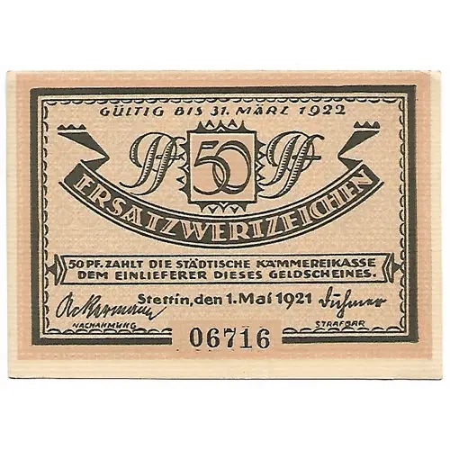 | Obverse lettering | GÜLTIG BIS 31. MÄRZ 1922 50PF ERSATZWERTZEICHEN 50 PF ZAHLT DIE STÄDTISCHE KÄMMEREIKASSE DEM EINLIEFERER DIESES GELDSCHEINES STETTIN, DEN 1. MAI 1921 |