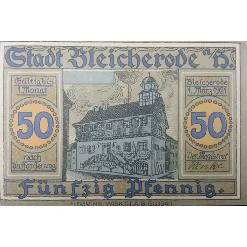 | Obverse lettering | Stadt Bleicherode a/H. 50 50 Gültig bis 1 Monat nach Aufforderung Bleicherode 1.März 1921 Der Magistrat Fünfzig Pfennig. FLEMMING-WISKOTT A G GLOGAU |