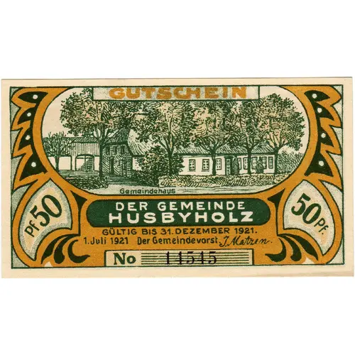 Chữ khắc mặt trước GUTSCHEIN Gemeindehause DER GEMEINDE 50Pf HUSBYHOLZ 50Pf GÜLTIG Bis 31 DEZEMBER 1921 1. JULI 1921. DER GEMEINDEVORSTAND: (signature)