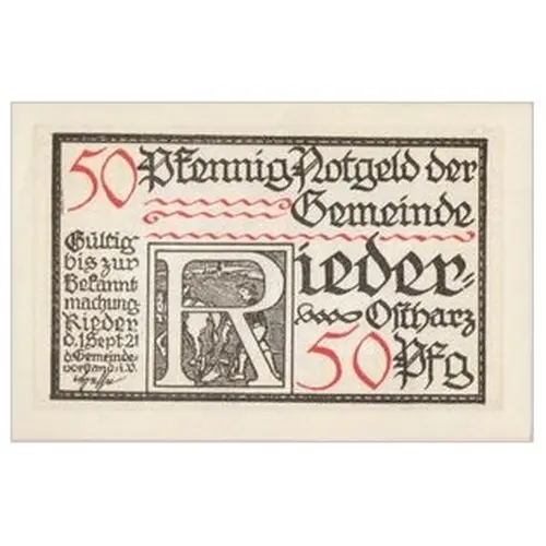50 Pfennig Notgeld der Gemeinde Rieder // Ostharz Gültig bis zur Bekanntmachung. Rieder d. 1. Sept. 21 d. Gemeindevorstand // i.V. (Translation: 50 pfennigs Notgeld from the municipality of Rieder // Eastern Harz mountains Valid until notice. Rieder the 1st of September 1921 The Municipal Board of Directors // on behalf of) |
