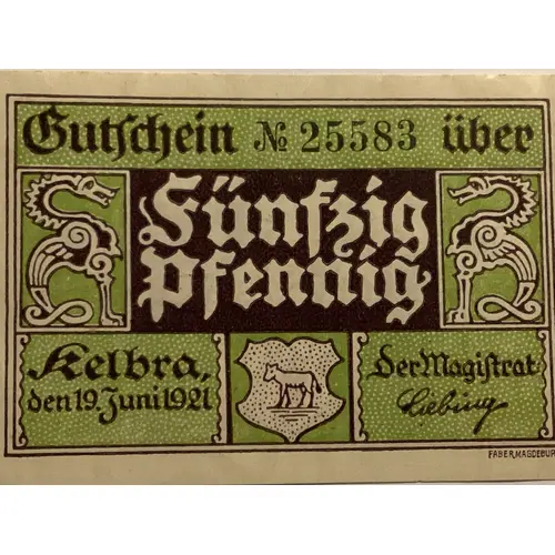 | Reverse description | Lettering (regular font): Gutschein über FÜNFZIG PFENNIG Kelbra den 19.Juni 1921 Der Magistrat |