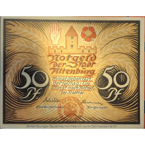 | Legenda del dritto | Notgeld Der Stadt Altenbŭrg 50Pf. 50Pf. Ausgegeben 1921 Derfalltag : Ein Monatnach Aŭfrŭf. Der Stadtrat |