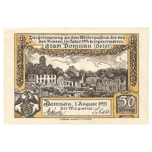 | Obverse lettering | zurerinerung an den wiederaufbau der von den russen im jahre 1914 kriegserstorten DOMNAU 1. august 1921 50 PFENNIG |