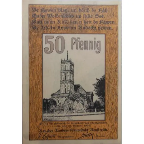 Landeshauptstadt Neustrelitz Reutergeld 50 Pfg. (Translation: State capital Neustrelitz Reuter money 50 pfennigs) |