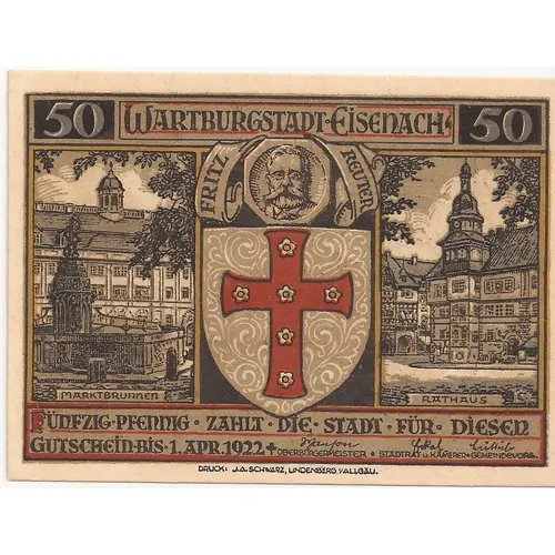 (Translation: Wartburgcity of Eisenach Fritz Reuter Market fountain town hall Fifty pfennigs are paid by the city for this voucher until April 1, 1922)