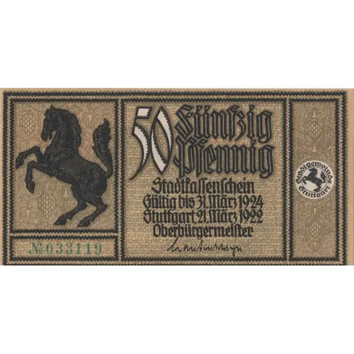 Obverse lettering 50 Fünfzig Pfennig Stadtkassenschein Gültig bis 31. März 1924 Stuttgart, 21 März 1922 Oberbürgermeister Stadtgemeinde Stuttgart