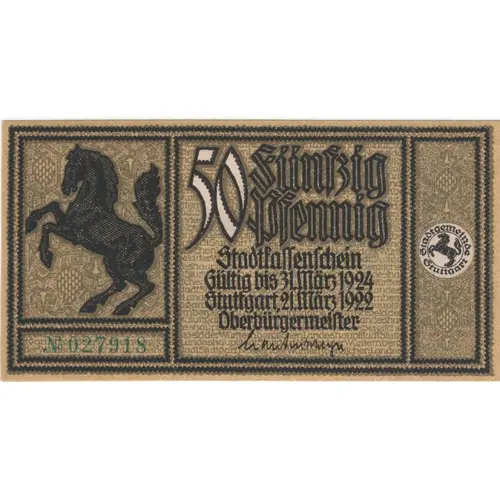 | Obverse lettering | 50 Fünfzig Pfennig Stadtkassenschein Gültig bis 31. März 1924 Stuttgart, 21 März 1922 Oberbürgermeister Stadtgemeinde Stuttgart |