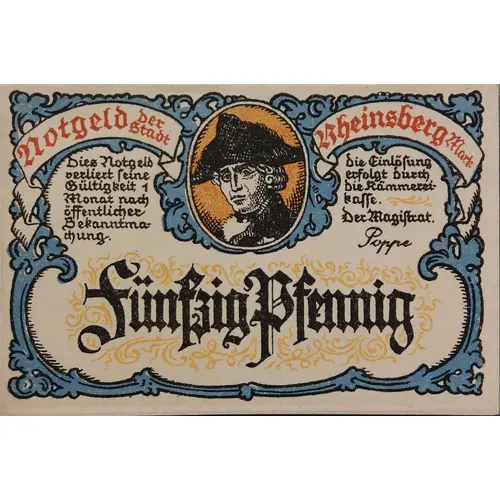Notgeld der Stadt Rheinsberg Mark Dies Notgeld verliert seine Gültigkeit 1 Monat nach öffentlicher Bekanntmachung. die Einlösung erfolgt durch die Kämmereikasse. Der Magistrat Fünfzig Pfennig (Translation: Notgeld of the city of Rheinsberg Mark This emergency money loses its validity 1 month after public notice. the redemption takes place by the combing fund. The Magistrate Fifty pfennigs) |